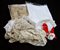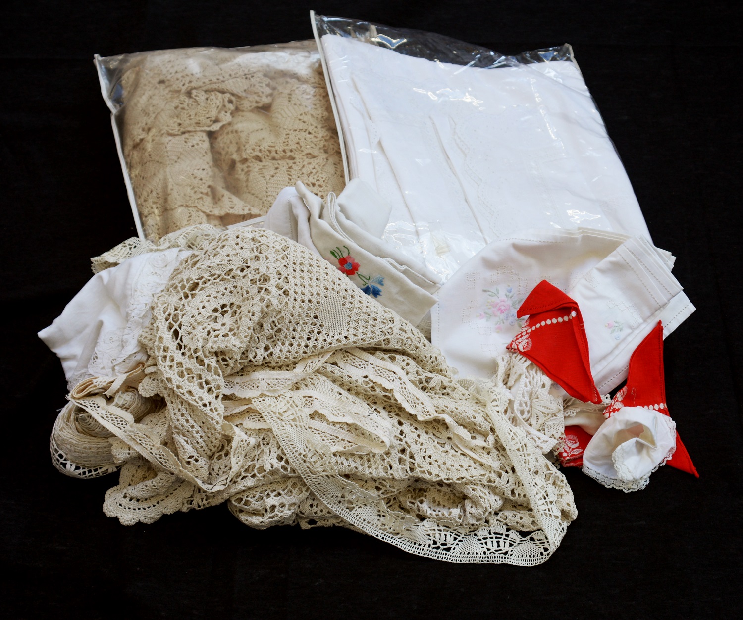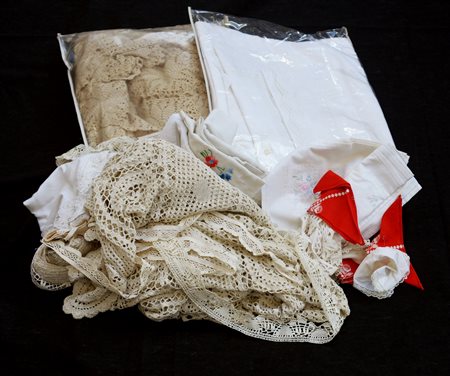 Cartone contenente numerosi tessuti e pizzi di varie fogge e dimensioni e tre paia di guanti in pizzo. Misure diverse