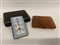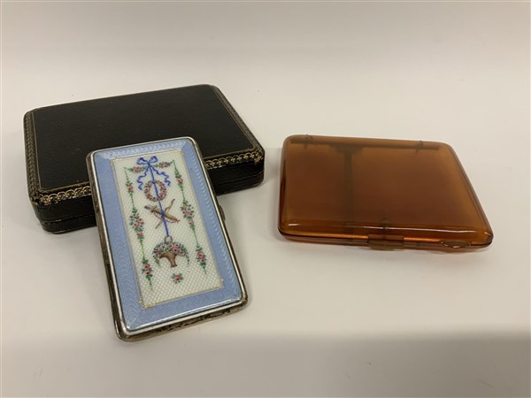 Portabiglietti in argento inciso con coperchio a decoro guilloché e smalti policromi, unito ad un portasigarette in resina color ambra (difetti)