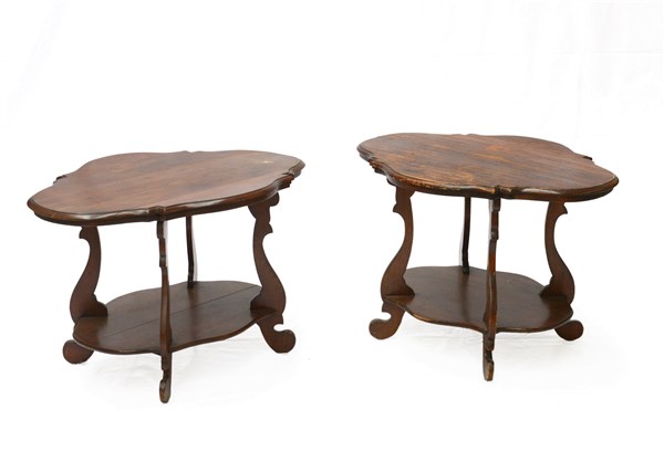 Coppia di tavolini in legno con due ripiani e montanti sagomati (cm 87x58x64) (