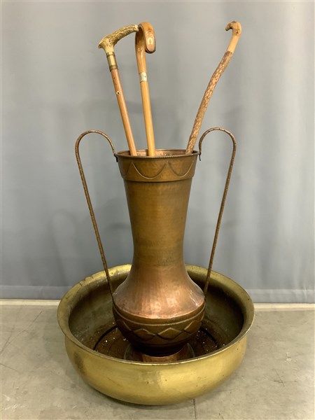 Lotto composto da una fioriera, un portaombrelli biansato in rame e tre bastoni