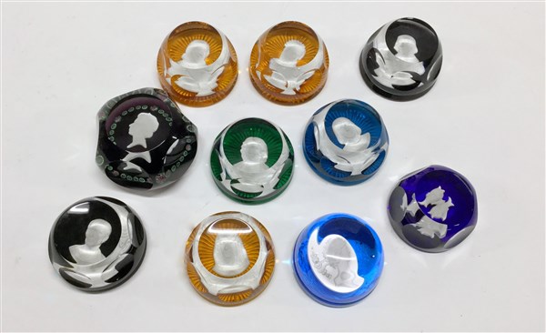 Lotto composto da dieci presse-papiers in vetro decorati con profili di persona