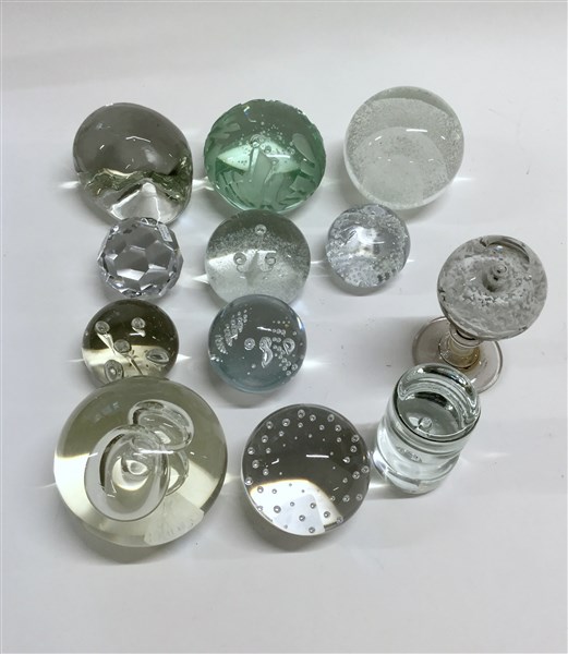 Cartone contenente dodici presse-papiers in vetro incolore di manifatture diverse (lievi difetti)