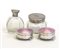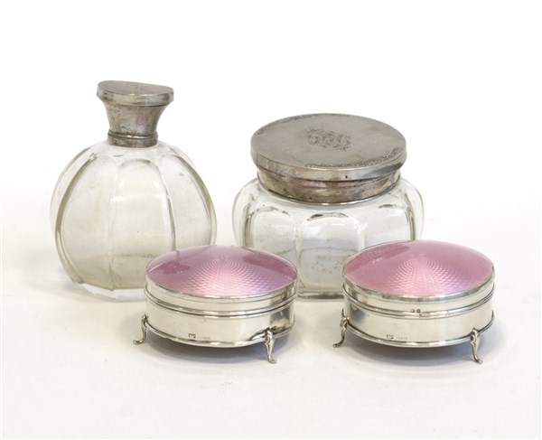 Lotto composto da quattro contenitori da toilette in vetro, due con coperchi in argento e due con coperchi smaltati (difetti)