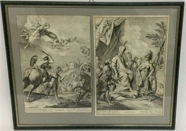 Due acquaforti monocrome raffiguranti scena dalla Gerusalemme librata, secolo XVIII, misure leggermente diverse (max cm 30,5x20,5) (difetti)