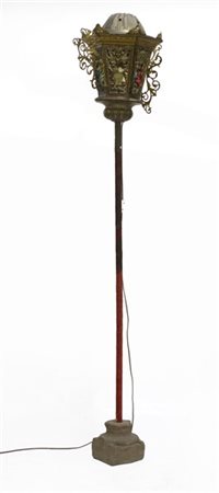Lanterna da parata di forma esagonale in metallo dorato e ottone decorato a sbalzo montata su fusto a colonna in legno su base a capitello in marmo, montato a luce elettrica (h cm 214) (difetti e mancanze)