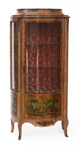 Vetrina di forma bombata lastronata ad un'anta, fascia inferiore decorata da tre pannelli dipinti in policromia a paesaggi, profili, fregi e guarnizioni in metallo (cm 76x161x50) (difetti e mancanze)