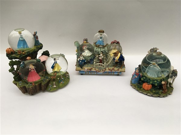 Lotto 1584 | Tre carillon Disney con snowglobe di soggetti differenti, resina policroma e ve