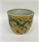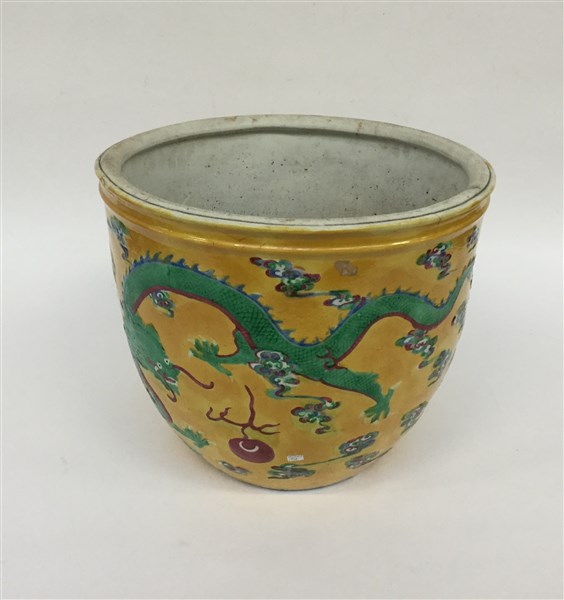 Cachepot in porcellana a smalti policromi su fondo giallo decorato con motivo di drago in rilievo. Cina, sec. XX (d cm 41 x h cm 31) (difetti)