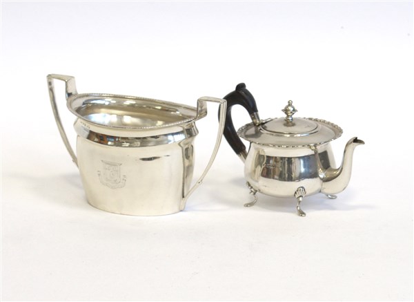 Lotto composto da piccola teiera e una zuccheriera biansata in argento. Marchi inglesi (g lordi 680 ca.) (lievi difetti)
