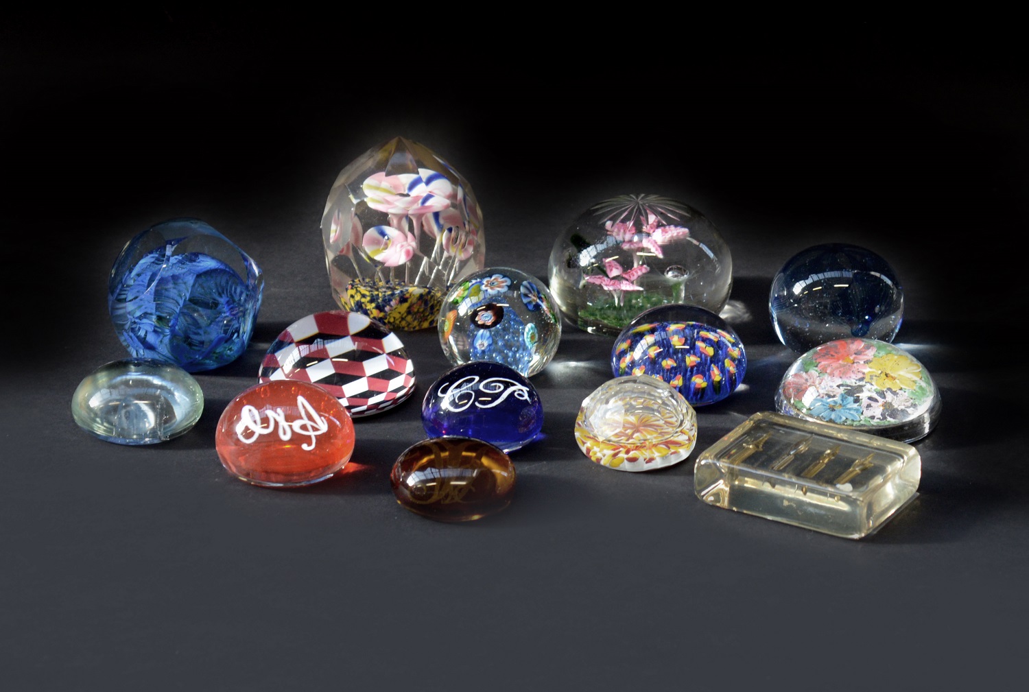 Cartone contenente numerosi presse papiers di diverso decoro, alcuni firmati (lievi difetti)