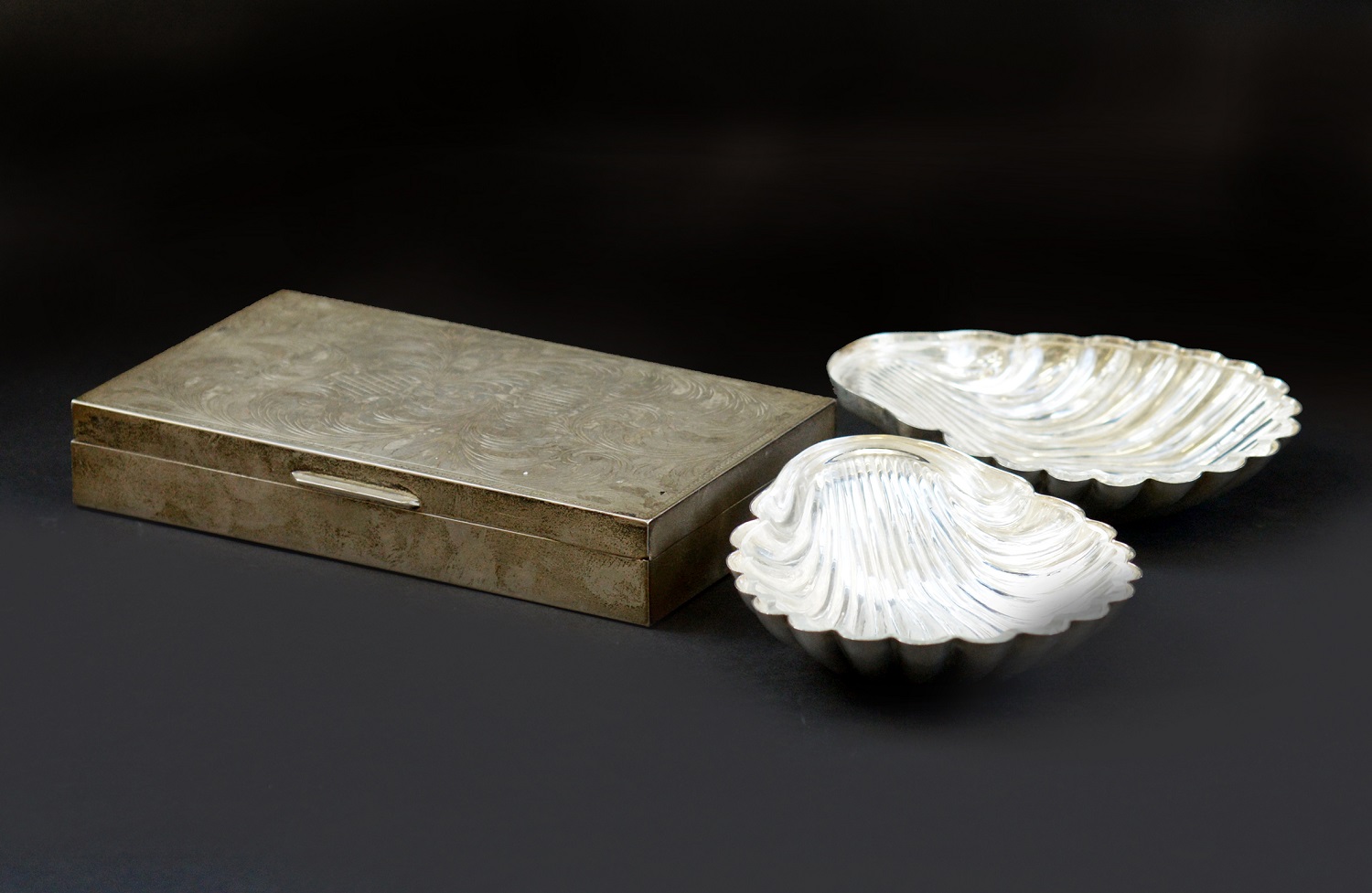 Lotto composto da due contenitori per caviale a forma di conchiglia ed un porta sigarette cesellato, in argento e vetro (lievi difetti)