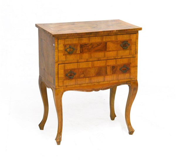Comoncino a due cassetti lastronato in radica e filettato, gambe e fascia sagom