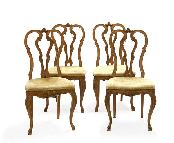 Gruppo di quattro sedie con schienale sagomato a giorno, gambe e fascia mosse e intagliate a motivi vegetali (difetti)