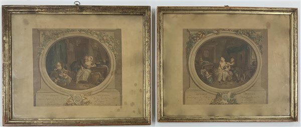Coppia di incisioni francesi a colori (cm 40x50) raffiguranti scene galanti, in