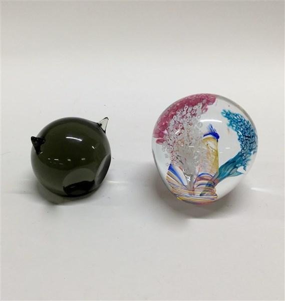 Lotto composto da due presse-papiers di manifatture diverse uno a testa di civetta (lievi difetti)