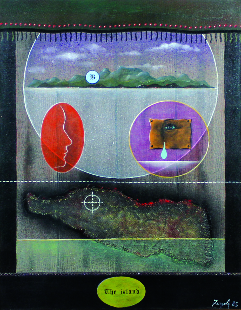 Fergola Sergio L'isola, 1985 olio e applicazioni su tela cm 80x60 firmato in basso a destra, firmato intitolato e datato al retro