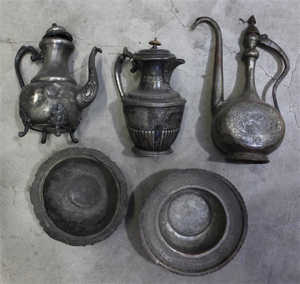 Lotto composto da tre versatoi e due contenitori in metallo inciso di fatture differenti (difetti)
