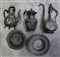 Lotto composto da tre versatoi e due contenitori in metallo inciso di fatture d