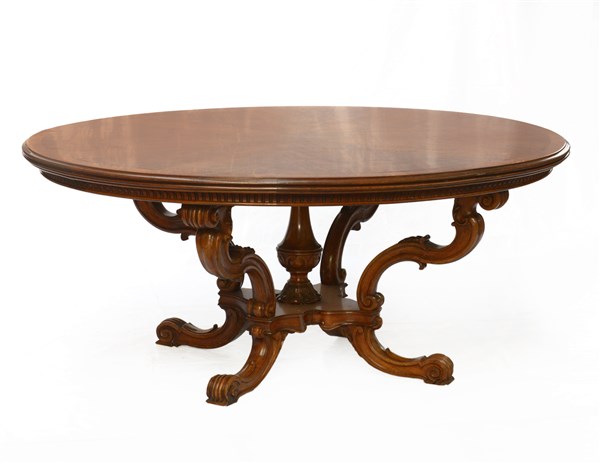 Tavolo con piano ovale lastronato con quattro gambe sagomate, intagliate e riun