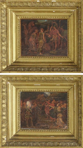 Ignoto "Scena religiosa e scena storica" coppia di dipinti ad olio su tavola (cm 18x22,5) In cornici in legno e pastiglia dorata (difetti, restauri e mancanze)