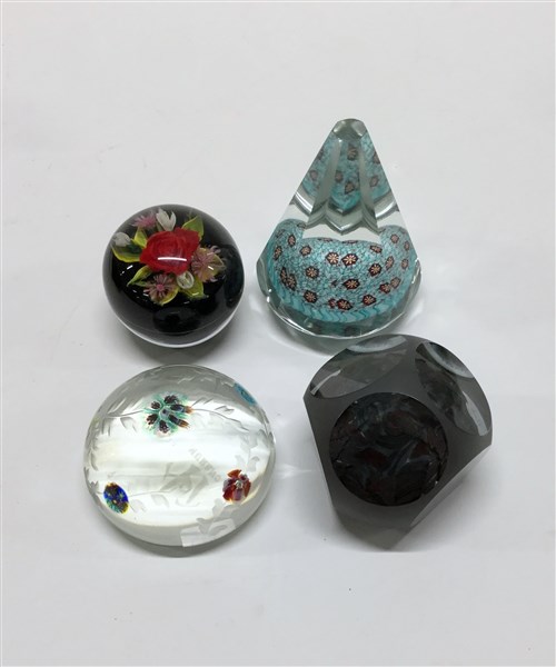 Gruppo di quattro presse-papiers di differente decoro, alcuni firmati (lievi difetti)