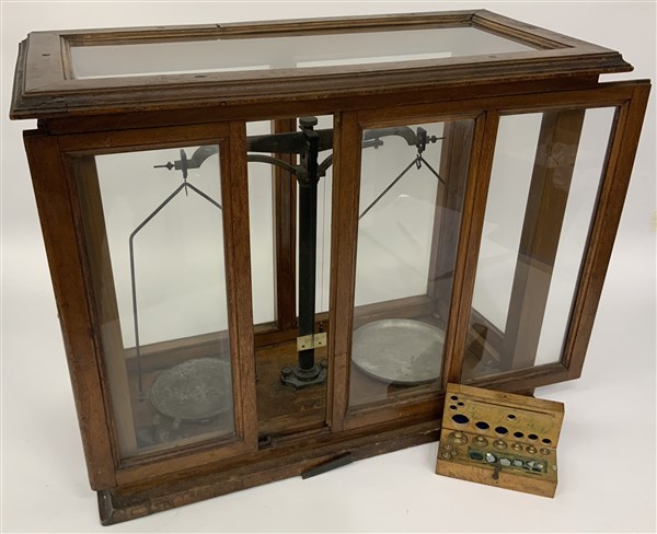 Bilancia da precisione con pesi, contenuta in teca (cm 66x53x30) (difetti e mancanze)