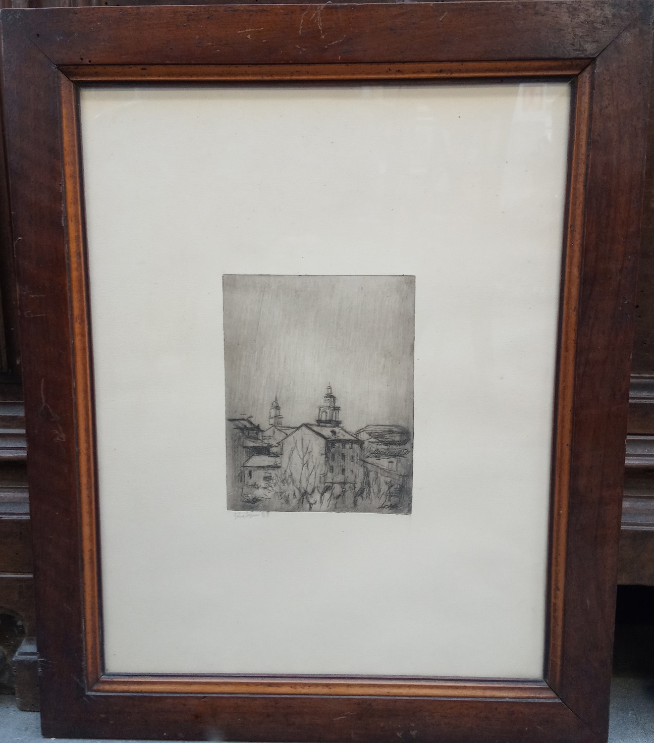 Lotto composto da un' acquaforte raffigurante "gatto" e due raffiguranti "scorci di paese" autori e misure diverse, in cornici