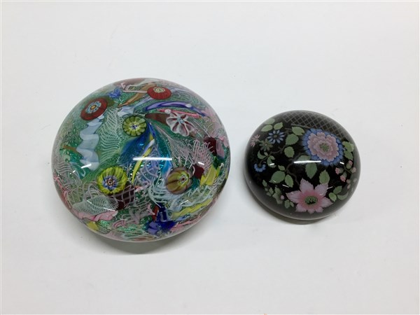 Lotto 1688 | Due grandi presse-papiers decorati a murrine e vaso fiorito (lievi difetti)