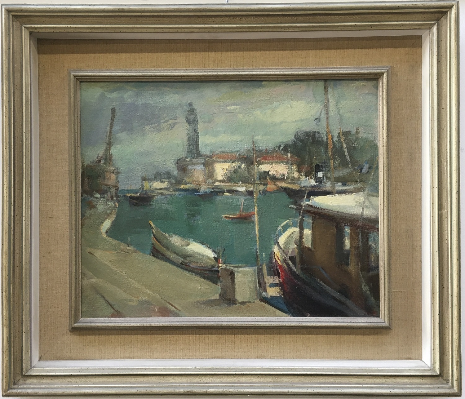 "Porto di Rimini'' e ''Le case di Bertù ad Aglié'' due dipinti ad olio su masonite (cm 40x50) Al retro: cartigli. In cornici (lievi difetti)