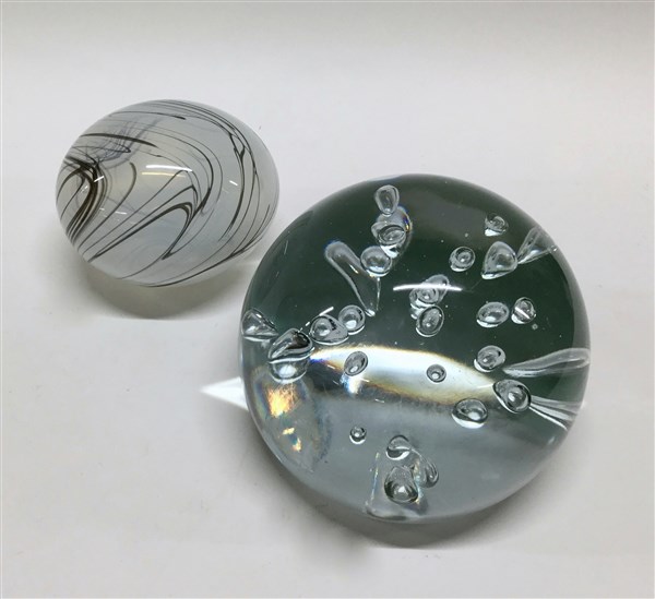 Due grandi presse-papiers in vetro soffiato e non, uno siglato GM (lievi difetti)