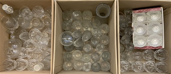 Lotto di tre cartoni contenenti numerosi bicchieri in cristallo di fatture diff