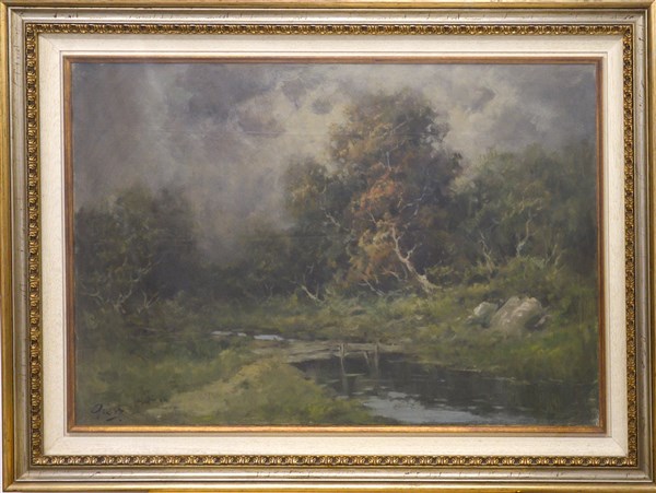 Firma indecifrata "Paesaggio fluviale" olio su tela (cm 70x100) Firmato in basso a sinistra. In cornice