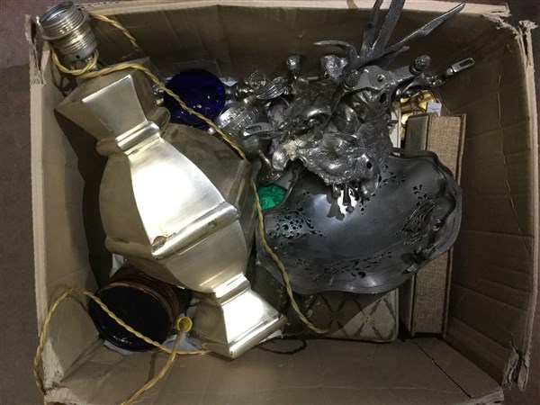 Cartone contenente numerosi oggetti in metallo argentato ed altri materiali div