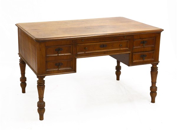Scrivania da centro lastronata in noce a cinque cassetti riquadrati e tiretto sottopiano, gambe tornite. Sec. XIX (cm 137x82x90) (difetti)