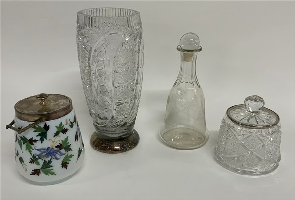 Lotto composto da un vaso, due contenitori con coperchio e una bottiglia con tappo in cristallo opaline argento e metallo argentato (Misure diverse) (difetti)