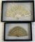 Lotto composto da due ventagli in madreperla e osso, pagina in stoffa decorata a motivi floreali, in teche di misure diverse (difetti)