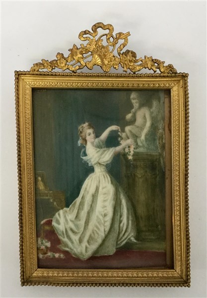 Ignoto del secolo XIX "Gentildonna in un interno" miniatura su avorio (cm 13x10) In cornice in metallo dorato (difetti)