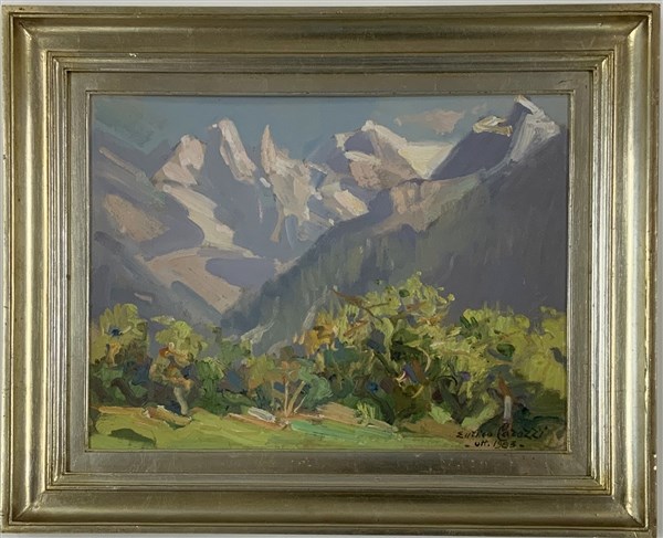 "Vista da Soglio - Svizzera- Valchiavenna" 1983 Olio su cartone telato (cm 30x40) firmato e datato in basso a destra, firmato e titolato al retro