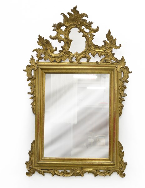 Specchiera in legno intagliato e dorato, cimasa centrata da specchio, fregi traforati e decorati a volute fogliate (cm 140x92) (difetti e restauri)