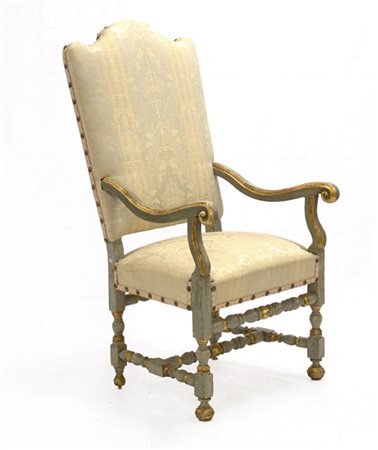Poltrona a schienale alto con gambe e traverse tornite a rocchetto laccate e dorate, sedile e schienale rivestiti in seta ricamata a fiori. (difetti e restauri)