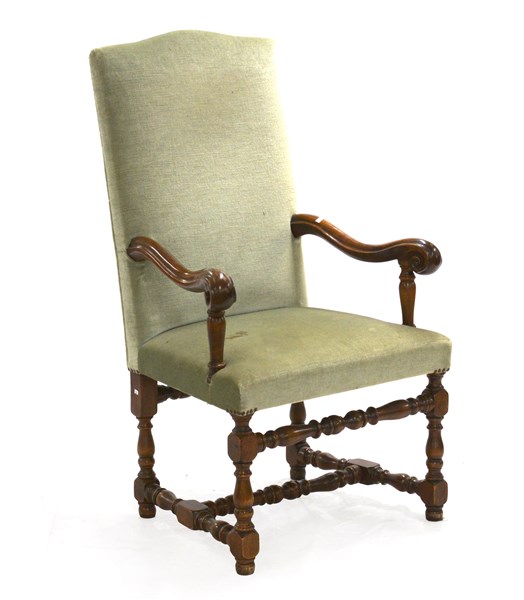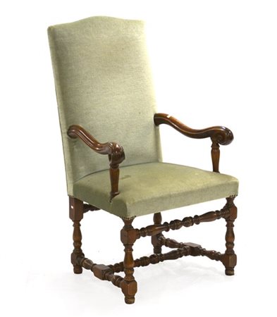 Poltrona con gambe e traverse a rocchetto, rivestita in velluto verde (difetti)