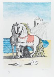 Giorgio de Chirico Volos 1888 - Roma 1978 Cavalli con gualdrappa rossa, 1976...
