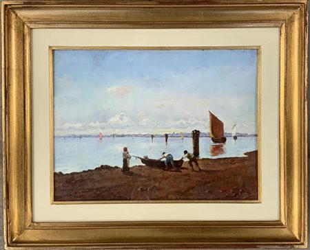 "Paesaggio lagunare" '37 olio su tavola (cm 27x35.5) Reca firma in basso a sinistra. In cornice