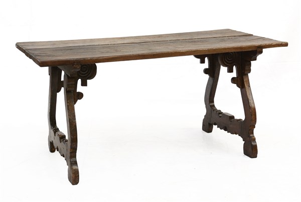 Antico tavolo rettangolare in noce con sostegni a lira (cm 166x79x81) (difetti e restauri)