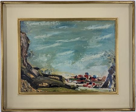 El. Rios "Paesaggio messicano", 1956, olio su cartone telato (cm 35x45) firmato e datato in basso a destra, etichetta al retro