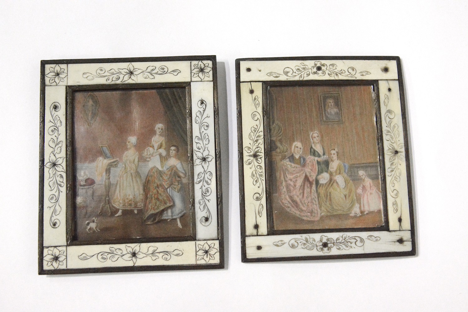 Ignoto della fine del secolo XVIII "La scelta del vestito" e "La vestizione" coppia di dipinti su pergamena (cm 9x6,5) in cornici in avorio decorate a fiori