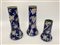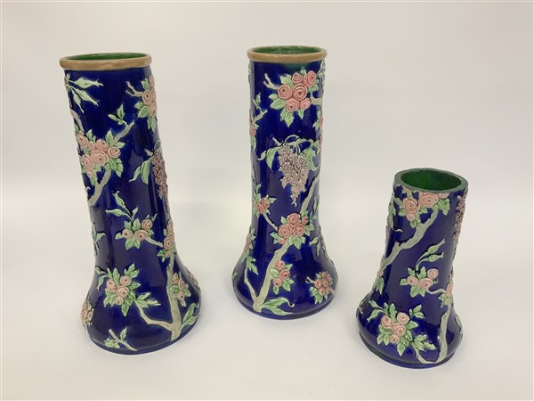 Gruppo di tre vasi in ceramica dipinta in policromia a motivi floreali in rilievo su fondo blu. (h max cm 37) (Difetti e modifiche )