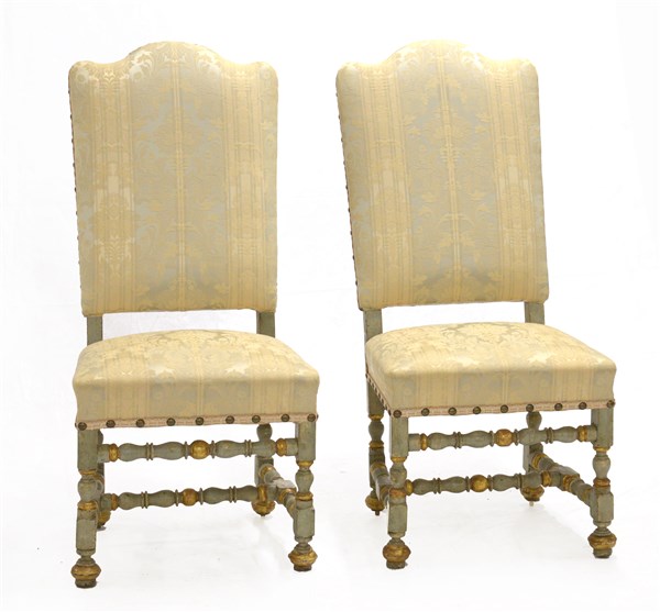 Coppia di sedie a rocchetto con gambe a traverse tornite, laccate e dorate. Seduta rivestita in seta ricamata a fiori (difetti e restauri)