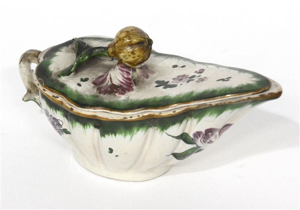 Manifattura del secolo XVIII. Salsiera in maiolica decorata in policromia a fio