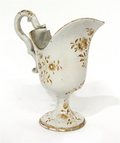 Manifattura del secolo XVIII. Versatoio in maiolica profilata in ocra e decorata